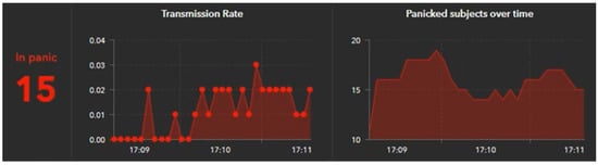 Notably, the transmission rate initially remains at negligible levels, implying that the entire crowd experienced panic from the very beginning. However, in the final minutes, there is a sudden surge in the transmission rate, reaching significantly higher levels, as the panicked crowd disperses and influences individuals on the opposite side of the square. Concurrently, the number of calm individuals experiences a noticeable decline, steadily approaching zero, as a consequence of the widespread panic that quickly permeated the crowd early on.