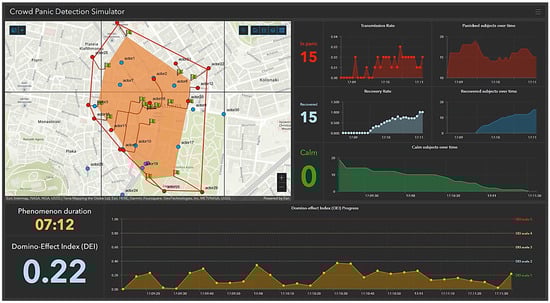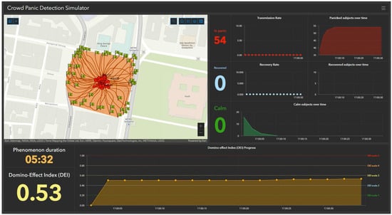Once a person is identified as stressed, the system performs real-time spatial analysis to monitor their movement and identify other stressed individuals in their vicinity. Based on their trajectories and adjacency, the system produces dynamic areas that represent the development of the phenomenon’s spatial extent in real time. For this purpose, a newly developed index called DEI (Domino Effect Index) is introduced, which further enhances the system’s ability to not only detect but also classify crowd panic emergencies. The term domino effect refers to the situation in which one event causes a series of related events, one following another. The DEI is designed to identify the severity of the detected emergency by taking into account various factors that contribute to the domino effect, such as the rate of panic transmission, the density of panicked people, and alignment with the road network.