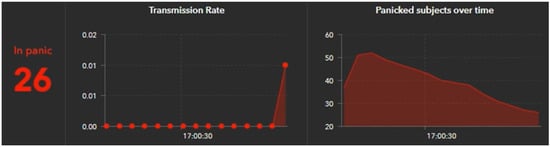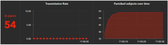 In Figure 23, it is evident that the population of panicked individuals experiences a significant and rapid increase from the initial moments, indicating the abrupt nature of the event and the immediate inundation of panicked individuals at the scene. Notably, the transmission rate remains at zero levels, indicating that the entire crowd became panicked right from the outset, leaving no individuals unaffected by the panic.