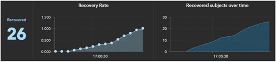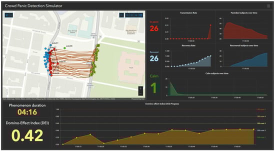 Next, in Figure 28, Figure 29, Figure 30 and Figure 31, one can see the current count of individuals categorized as stressed, calm, and recovered, enabling the effective monitoring of emotional distribution within the group. Real-time charts visually represent emotional trends for each category, aiding in the identification of influencing factors and individual transitions between emotional states. Moreover, the Panic Transmission and Recovery Rate Charts offer insights into the pace of panic propagation and the recovery rate, providing valuable information about intervention efficacy and overall group resilience. Additionally, the DEI Current Value provides real-time insights into the collective emotional state, reflecting stress and anxiety levels, while The DEI Progress Diagram tracks the evolution of the emotional state over time, shedding light on its progression throughout the scenario.