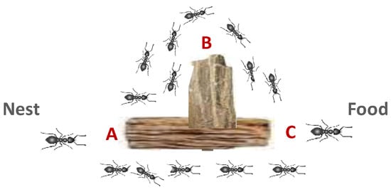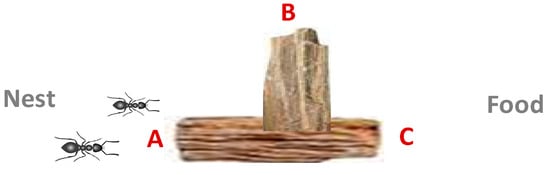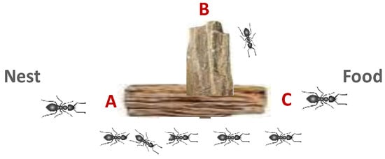 Over time, pheromones in each pathway will decrease due to the evaporation of pheromones. The evaporation process will reduce the pheromone levels in the pathway. The amount of pheromone evaporation can be formulated through Equation (2):