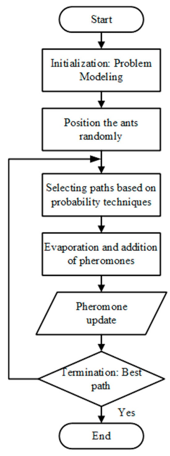 According to [22], stages of solving problems based on the Ant Colony algorithm consist of four steps. The first step is the initialization of the problem model, the second step is path selection, the third is evaporation and addition of pheromones, and the last stage is pheromone update. This step is carried out repeatedly until last best path termination is obtained.