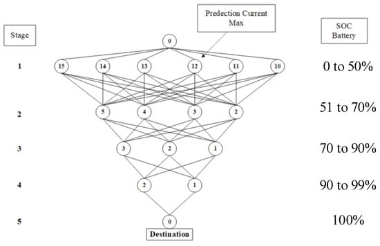 The ACO algorithm model is in the form of paths with variable flow rates. This modeling is divided into five stages, as presented in Table 1, where each stage has several possible flow variables that will be analyzed with the ACO algorithm to obtain a safe and fast charging flow pattern. The architecture of the ACO algorithm for five stages of modeling is presented in Figure 6.