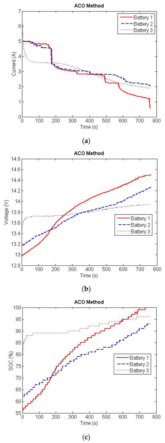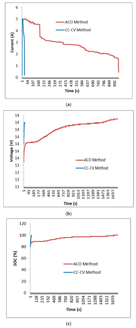 (a) Current to time graph of ACO and CC-CV method. (b) Graph of voltage against time for ACO and CC-CV method. (c) SOC graph against time for ACO and CC-CV method.
