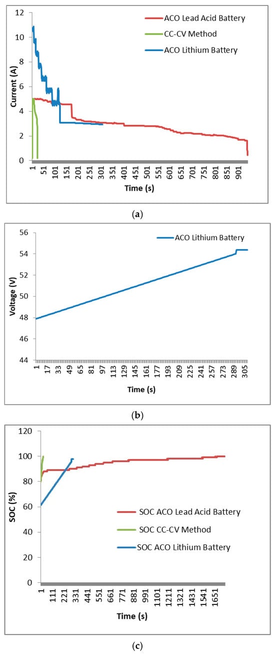 (a) Comparison of current prediction of ACO method for lead acid battery and lithium battery and CC-CV method. (b) Graph of voltage prediction of ACO method for lithium battery. (c) Comparison SOC prediction of ACO method for lead acid battery and lithium battery and CC-CV method.