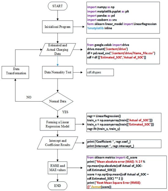 The linear regression flowchart shown in Figure 11 begins with program initialization, which is the process of entering the library that will be used in the linear regression data processing function, followed by uploading the SOC data file to Google Colab. Before being processed, the data will be tested for normality. The objective is to check whether the data can be processed further or not quantitatively. If the data are not normal, the data cannot be analyzed. Once normality data checking is complete, linear regression modeling can be performed with the Linear Regression() function. Linear regression modeling is obtained with coefficient and intercept values. The RMSE and MAE values are also calculated.