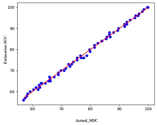 In Figure 12, the results of linear regression modeling are obtained. In the model, there is a red, straight line, which is a linear line from the regression function. The linear line is the relationship of the two variables processed, namely, the actual SOC and the estimated SOC. The linear regression model used is presented in Table 6 and Table 7, with a coefficient value of 1.00426298 and an intercept of −0.39176098. A final regression equation is presented in Equation (8).