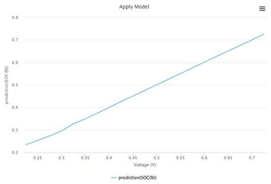 This study also presents a comparison between Supervised Learning Machine Learning (regression) and machine learning neural networks. Figure 13 is a graph of the output results using the neural network from the RapidMiner application, which shows the relationship between voltage on the X axis (horizontal) in the range of 0.2 to 0.7 and the estimated State of Charge (SOC) on the Y axis (vertical) in the range of 0.234 to 0.721 in the form of normalized data. In the graph, there is a blue line that shows the results of SOC prediction using a neural network.