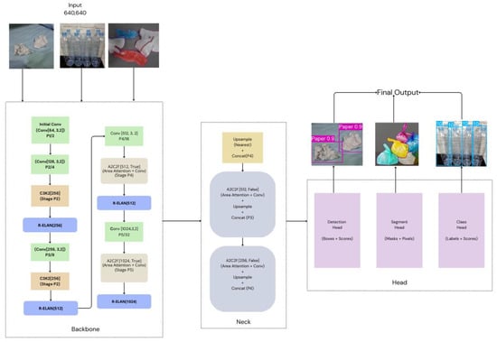 Figure 5 shows the framework of the suggested Yolov12-based waste identification model, which is carefully designed for effective, real-time, and scalable identification of various pixel-level waste materials. The architecture benefits from a three-stage processing of pipeline extraction, functional association, and object detection, promoting calculation efficiency without compromising accuracy. Constructed on advanced components such as the region’s attention, R-ELANE, and blinking, the system has been adapted to distribution in resources such as mobile and built-in systems.