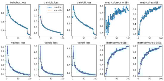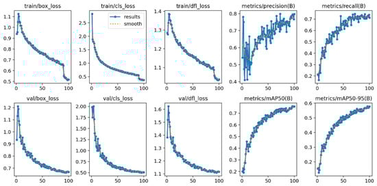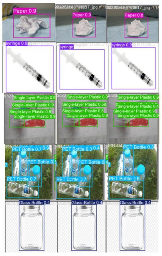 Yolov12 performed better, with stable training and even losses in loss values and a conversion accuracy of 100 epochs (Figure 6). It recorded the best F1 score of 0.75 and mAP@0.5 of 0.78 and revealed good learning ability and generalization. The precision of 70.73 and recall of 70.77 show a well-set model corresponding to different waste classes. Training loss over time decreased, usually from ~5.05 in epoch 1 to ~1.89 in epoch 100—assessed with initial limitations (patience = 100)—which shows the ongoing learning. Yolov11, the largest model (27.0 m parameter), performed equally to Yolov12, with an F1 score = 0.75 and mAP@0.5 = 0.76 (Figure 7). However, it failed to detect small obstacles sometimes. Further parameters for the model did not receive a predictable accuracy benefit, and its “low generalization capacity” limited performance benefits. The loss of training continued to decrease, but according to the confusion matrix, sometimes small and visually distracting objects were incorrectly identified or ignored. Confusion matrix analysis (Figure 8) reveals good recognition of general classes such as glass bottles and plastic, although the detection rate of extremely short or longer structures that spray was somewhat lower.