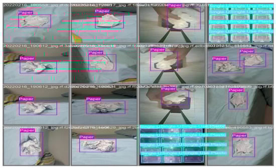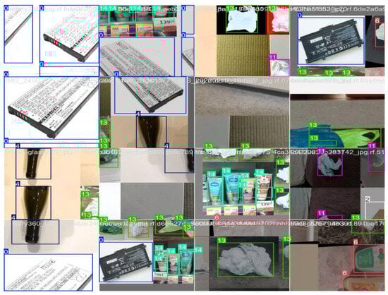 Resizing an image means giving all the images the same shape. Thus, the custom dataset with all images was resized to 640 × 640 pixels. After that, the resized images were labeled according to the seven classes shown in Table 1. The Roboflow annotation operation was applied for labeling data into multiple classes. In Figure 2, we show some sample labeled images for each class. Here, in the first column, the input images are shown, then in the second column, the class with a bounded box is shown, and lastly, the bounded box layer for each class is shown with different colors in the last column. The class ID in a bounding box is the name of the obstacle. For example, in this study, obstacle labels include Polythene, Battery, Plastic Bottle, HDPE Plastic, and Other Obstacles, as Figure 3 demonstrates. In this case, a bounding box surrounds one obstacle, and the class ID attached to it describes its category.