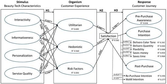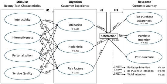 Cosmetics companies are increasingly integrating augmented reality and artificial intelligence technologies into products and services referred to as beauty tech; consumer perceptions of these solutions, however, remain understudied. Data generated via an online survey are implemented in a stimulus–organism–response framework, deduced from the beauty tech literature. Thereupon, the study identifies how interactivity, informativeness, personalization, and service quality of digital and physical beauty tech solutions for home use affect utilitarian and hedonistic values and the perceived risk factors among consumers. Via customer satisfaction, the effect of the value perception on the purchase intention and loyalty is considered. Results hint at strong effects of characteristics of the services and applications on the utilitarian and the hedonistic dimension of customer experience, which in turn strongly influence customer satisfaction. Perceived risk factors play only a marginal role. Only regarding the tested physical product does higher service quality add to the customer experience. Customer satisfaction in turn results in positive brand perception across different stages of the customer journey and leads to a higher purchase intention, positive brand advocacy, and a higher re-purchase intention. Consequently, well-designed solutions can generate higher customer satisfaction and loyalty on multiple stages along the customer journey.