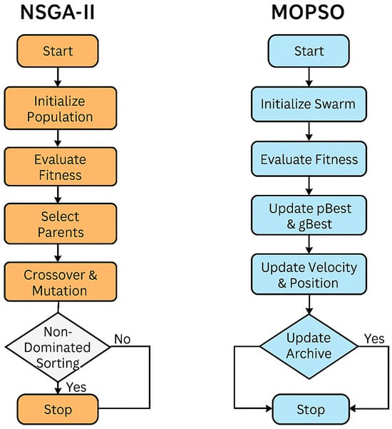 To better illustrate the optimization mechanisms used in this study, the main procedural steps of both the NSGA-II and MOPSO algorithms are summarized in Figure 1.