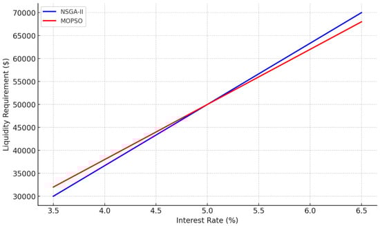 The impact of these differences is further illustrated in Figure 2, which presents a line chart comparing the liquidity requirements under NSGA-II and MOPSO. As interest rates increase, the liquidity requirements rise for both models, but the trend under MOPSO remains more stable compared to NSGA-II. This aligns with the expectation that MOPSO solutions prioritize financial robustness, whereas NSGA-II enables more dynamic adjustments to financing strategies.