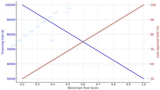 Figure 3 provides a dual-axis line chart to visualize these relationships, illustrating how blockchain trust scores influence financing costs (blue line) and loan approval rates (red line). The downward slope of the blue line confirms that suppliers with higher trust scores receive financing at a lower cost, while the upward trend of the red line highlights increased loan approval rates for trusted suppliers. These findings underscore the strategic importance of leveraging blockchain technology to enhance financial credibility and secure improved access to capital.
