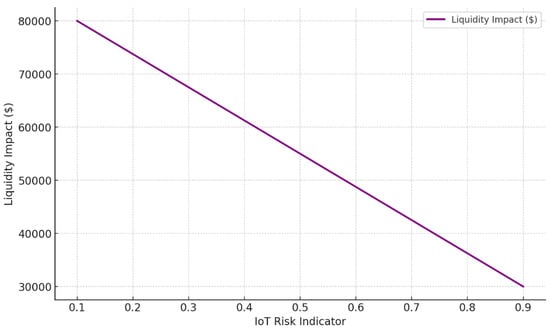 Figure 4 presents a line chart mapping IoT risk indicators against liquidity impact to further illustrate this relationship. The downward slope confirms that liquidity availability decreases as IoT risk levels increase. This visualization emphasizes the importance of operational stability in securing financial resources. Firms with lower IoT risk indicators tend to maintain more substantial liquidity positions, enabling them to negotiate more favorable financing terms.