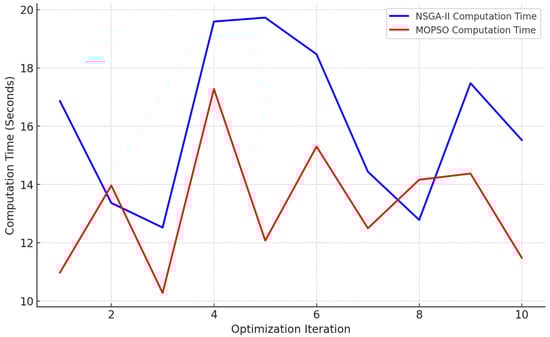 A crucial aspect of multi-objective optimization is the computational efficiency of various algorithms. Figure 5 compares the computational time for NSGA-II and MOPSO across multiple iterations.