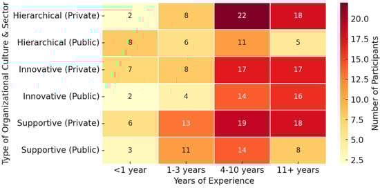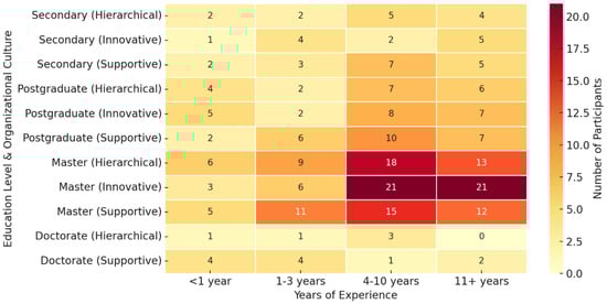 Continuing the analysis, RQ3 was based on combined visualization of the demographic data with heatmap diagrams, as well as exploration of patterns in the correlations between characteristics such as education level, job position, years of experience, and culture type. The distribution tables and the visualizations with Python (matplotlib, seaborn) showed that younger employees, with higher education, higher positions, and extended digital experience, tend to report higher digital competence.