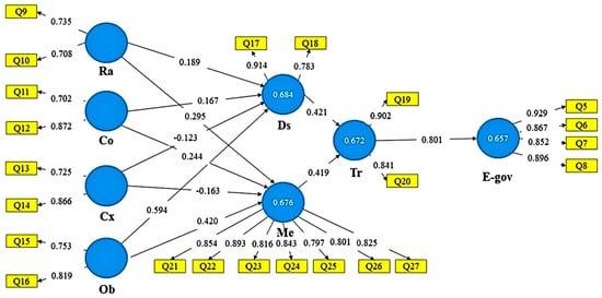 SEM was employed to test and validate the proposed relationships using a multivariate approach, with SPSS version 26.0 and SmartPLS facilitating Confirmatory Factor Analysis (CFA) [78]. All measurement scales were assessed for reliability and construct validity through CFA. This method was chosen due to the number of factors and the relationships between factors and their corresponding measurement variables, as previously described [79]. To evaluate whether the proposed model fits the empirical data, a structural model was developed to explore the hypothesized pathways (path model testing). Hypotheses were tested using multiple regression analysis, which examined the relationships between several independent variables and dependent variables, such as trust in e-government and its driving forces. The analysis also explored the varying relationships between trust and the use of e-government/e-government adoption. Multiple regression analysis provided valuable insights into the overall model, allowing researchers to assess whether adding variables improved the model’s predictive power [80].