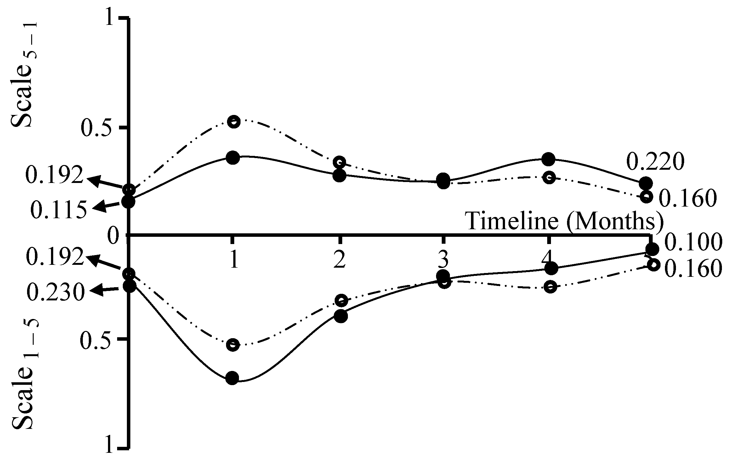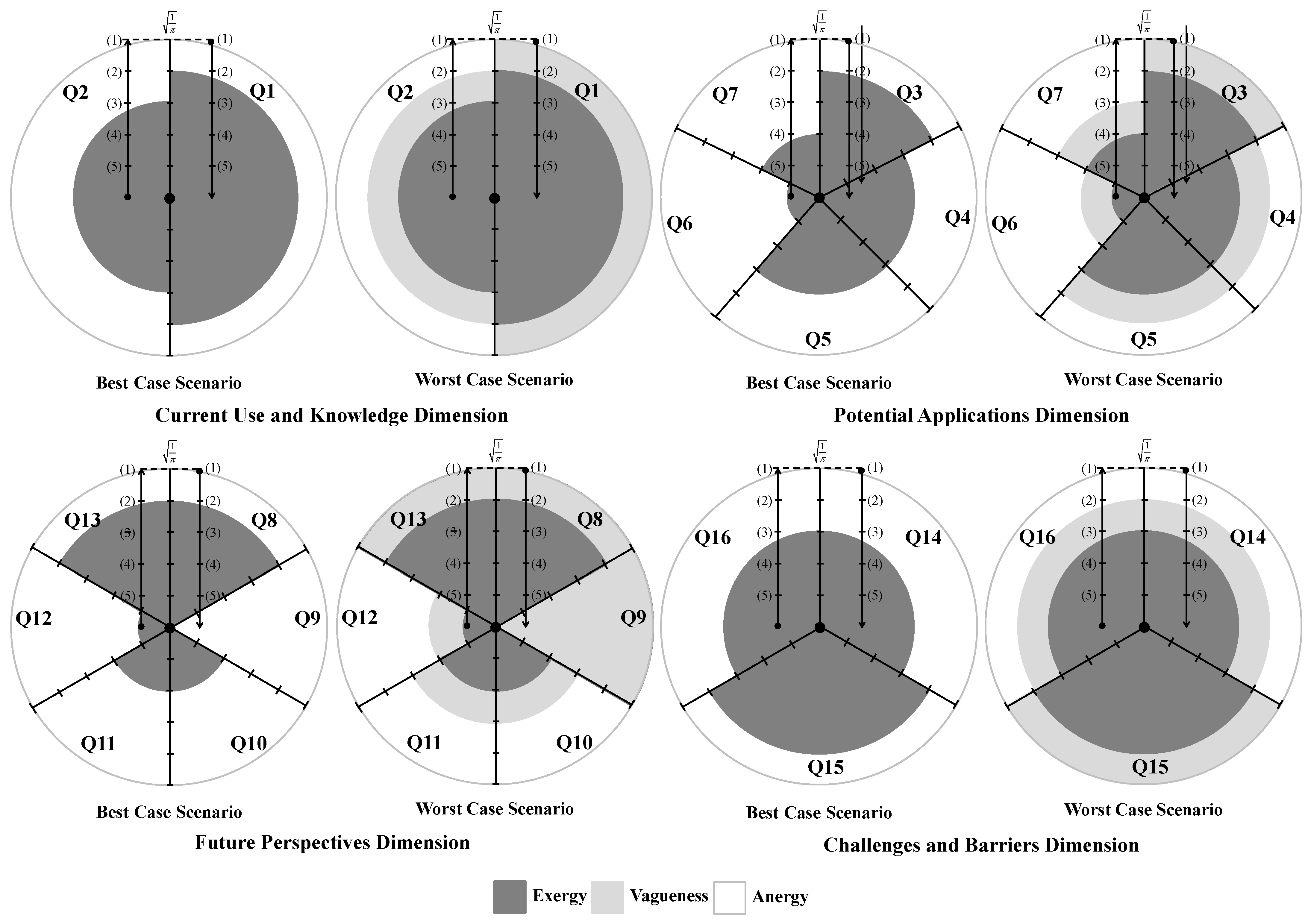 Table 8 presents the correspondent responses in terms of the extended Likert scale. For example, for the future perspectives dimension at month 0 the response to Q8 was not at all important (1), with no indicated trend. This response should be interpreted on the positive scale, ranging from not at all important (1) to very important (5), as it may remain stable or increase over time. For Q9 the I don’t know option was selected, indicating uncertainty. In this case, while the precise values for exergy, vagueness, and anergy cannot be determined, their range is known to lie between 0 and 1 [
