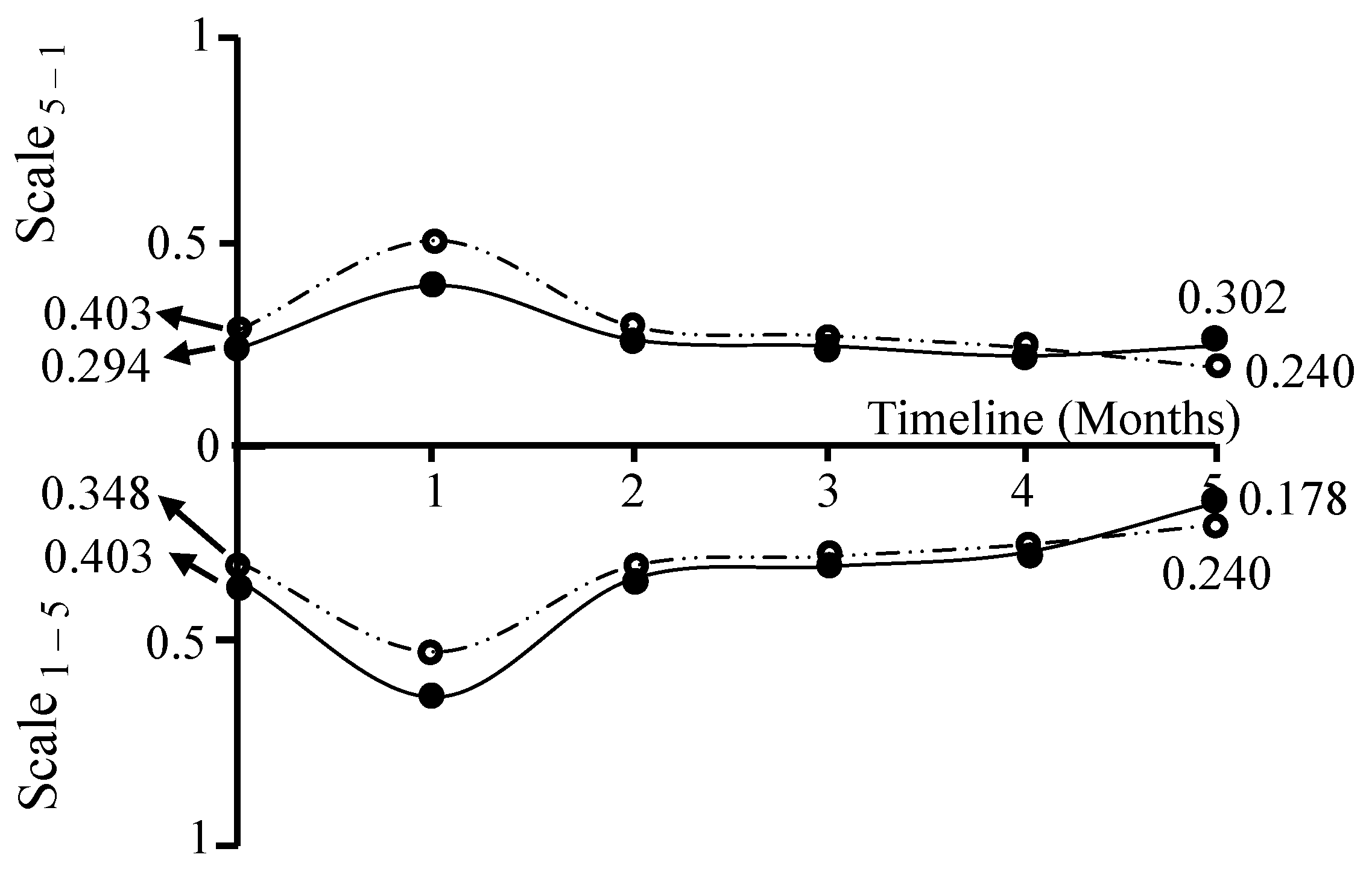 Figure 3 displays the outcomes derived from applying the previously discussed theorems to the participants’ responses across the study period for the BCS. The output of Theorem 1 is mapped along a scale ranging from 5 to 1, while Theorem 2 is represented on a scale from 1 to 5. This graphical representation reveals key trends in the participants’ ES under both evaluation scales.