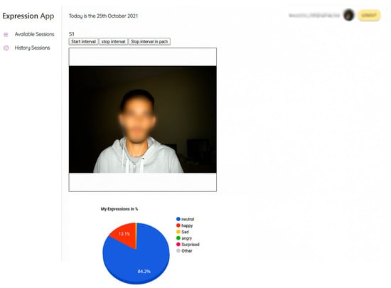 To record or analyze students’ emotions, the teacher must first create a group and then add the students involved in this experience to this group. Students subsequently receive an invitation email to join the group, which they must accept in order to participate. After that, the teacher has to create a session in the application which should normally correspond to a real course session that will take place either in the classroom or remotely. Subsequently, they must specify the group related to this session. At the scheduled time, students open the application and enter the session, granting access to their front-facing cameras. Once access is granted, the application begins detecting their emotions from facial expressions. During the session, students can view their detected emotions in real time, and teachers can visualize students’ emotions through dashboards provided by the application.