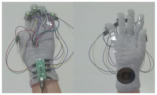 Although Figure 2 illustrates the theoretical placement of the sensors, it does not convey the physical assembly and integration of components. To complement this schematic, Figure 3 displays real photographs of the glove prototype from various angles, highlighting the wiring structure, sensor alignment, and overall ergonomic configuration of the wearable system.