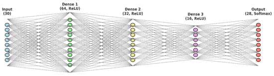 The network consists of an input layer (30 features), three hidden layers (64, 32, and 16 neurons, respectively, with ReLU activation), and an output layer with 28 neurons using Softmax activation.