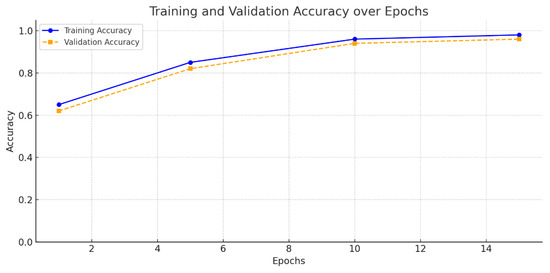 To better visualize the learning dynamics of the ANN, the evolution of training and validation accuracy, as well as the loss function, was plotted over 15 epochs. As shown in Figure 6 and Figure 7, the model demonstrates consistent improvement and convergence. The training and validation accuracy curves increase steadily and remain closely aligned, indicating low overfitting. Likewise, the training and validation loss curves exhibit a smooth and monotonic decrease, further confirming the effectiveness and stability of the training process.