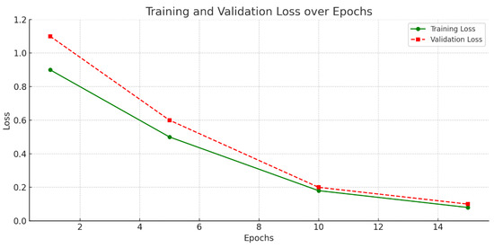 Figure 6 and Figure 7 show a consistent improvement in both accuracy and loss over the training epochs. The training and validation accuracy curves remain closely aligned, reaching 98% and 96%, respectively, indicating strong generalization and stable learning. Similarly, the training and validation losses decrease steadily and converge below 0.1, confirming effective optimization and the absence of significant overfitting.