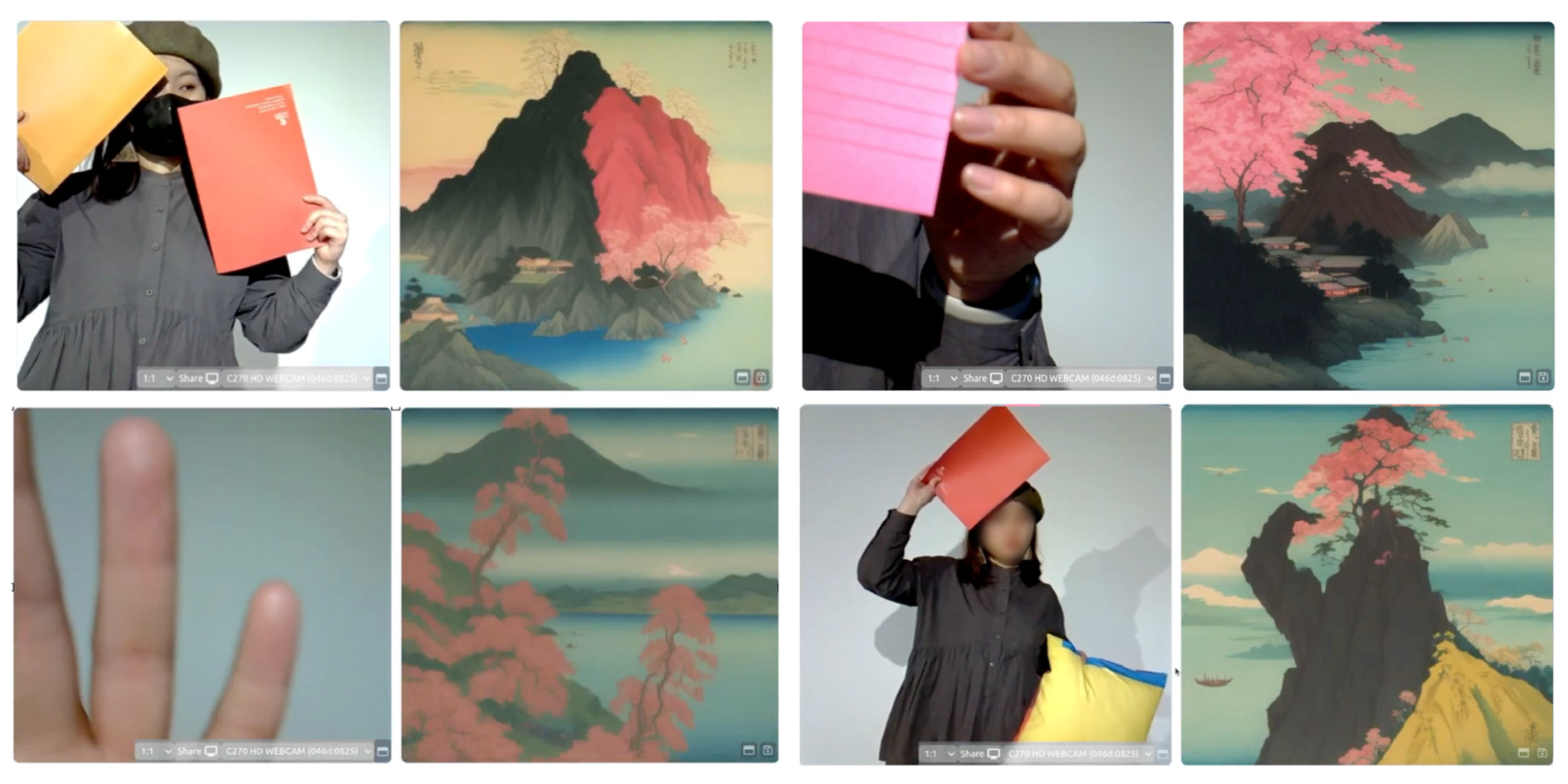 - The most consistent and impactful user interactions were mediated through tangible objects. Participants rapidly grasped that presenting physical objects to the camera would influence the generative system’s output in real time.