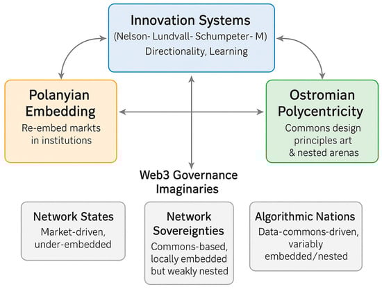 This Polanyi–Ostrom synthesis sharpens the innovation systems tradition. Classic accounts—from Schumpeter’s “creative destruction” to Nelson’s and Lundvall’s comparative and interactive learning perspectives—already insist that innovation outcomes hinge on institutions, capabilities, and social learning [7,43,54]. Mazzucato’s mission-oriented approach adds that public actors can shape directionality toward social goals [44]. But Polanyi specifies the stakes (preventing disembedding and elite capture), while Ostrom supplies the toolkit (design principles and polycentricity) for making decentralized infrastructures actually democratic. Seen this way, Web3 is not a revolution that makes institutions obsolete; it is a stress test of institutional embedding: who sets the rules, who monitors, who can contest, and at what scale?