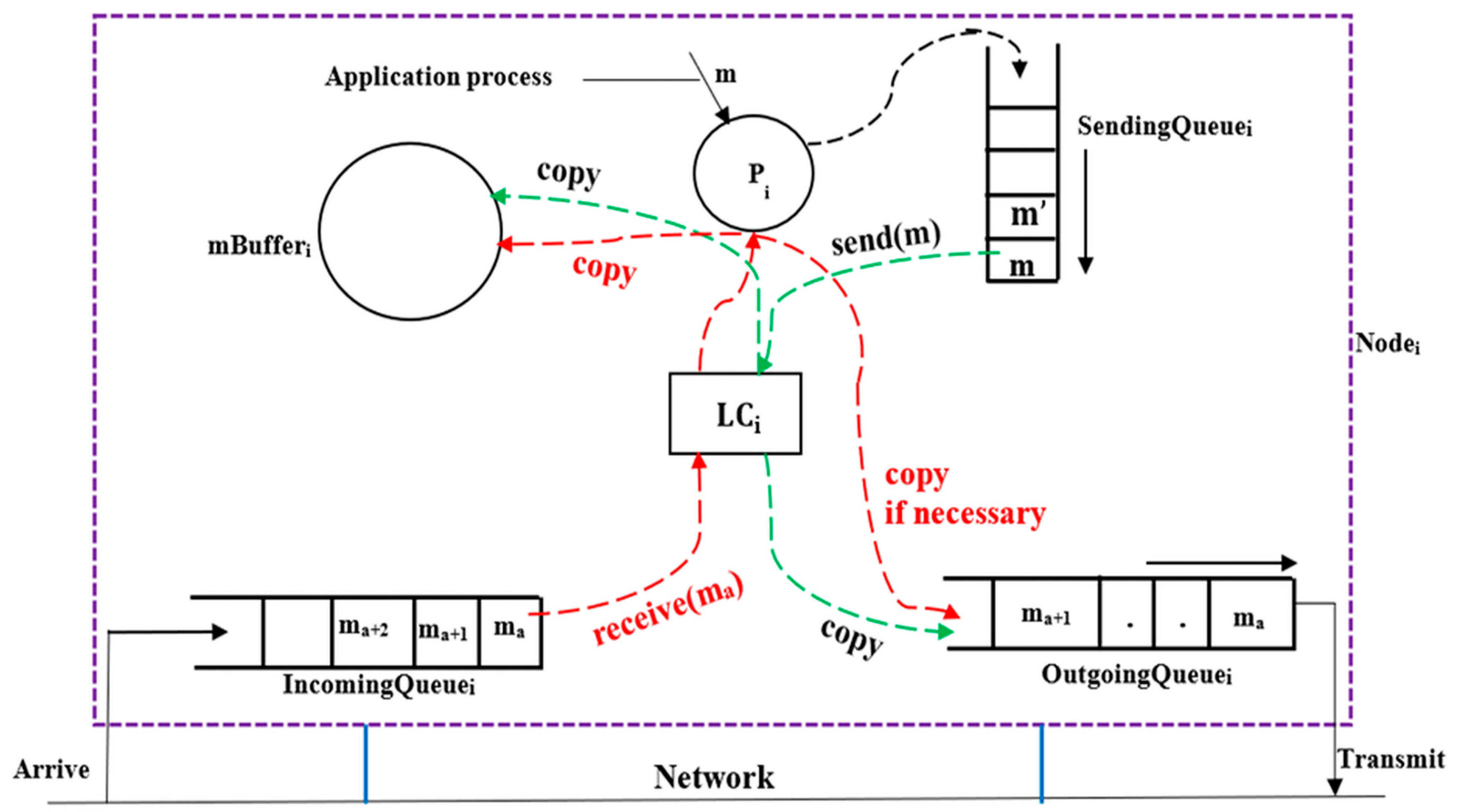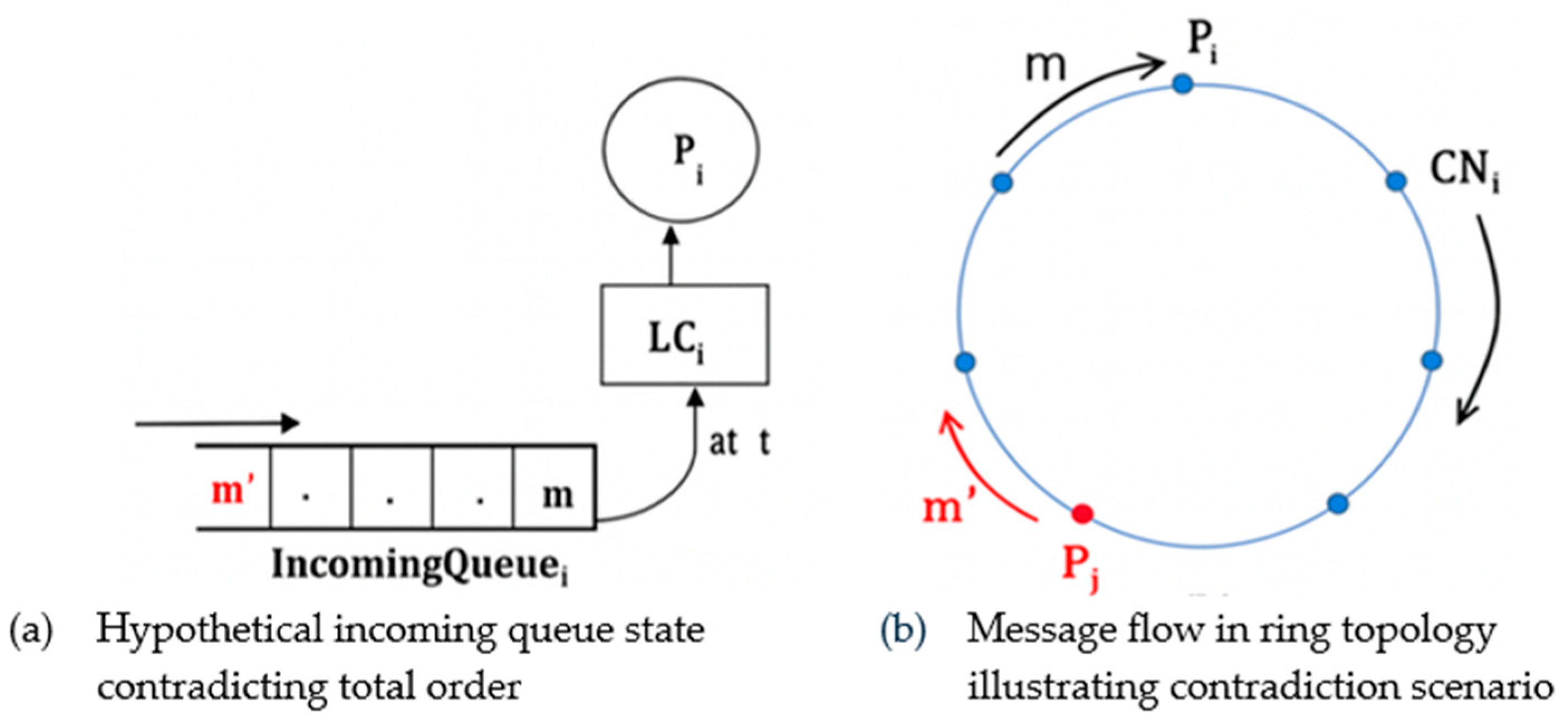 (ii) Dynamically determine the “Last” Process for ordering concurrent messages. Instead of relying on a globally fixed last process for ordering concurrent messages, as in LCR, this study proposes a dynamically determined last process based on proximity to the sender in the opposite direction of message flow. This adaptive mechanism improves ordering flexibility and enhances system responsiveness under high workloads. (iii) Reduce message delivery latency. This study proposes reducing the value of f to (N − 1)/2 to minimise the overall message delivery latency and enhance system efficiency. This contrasts with the LCR approach, where f is set to N − 1. Specifically, when