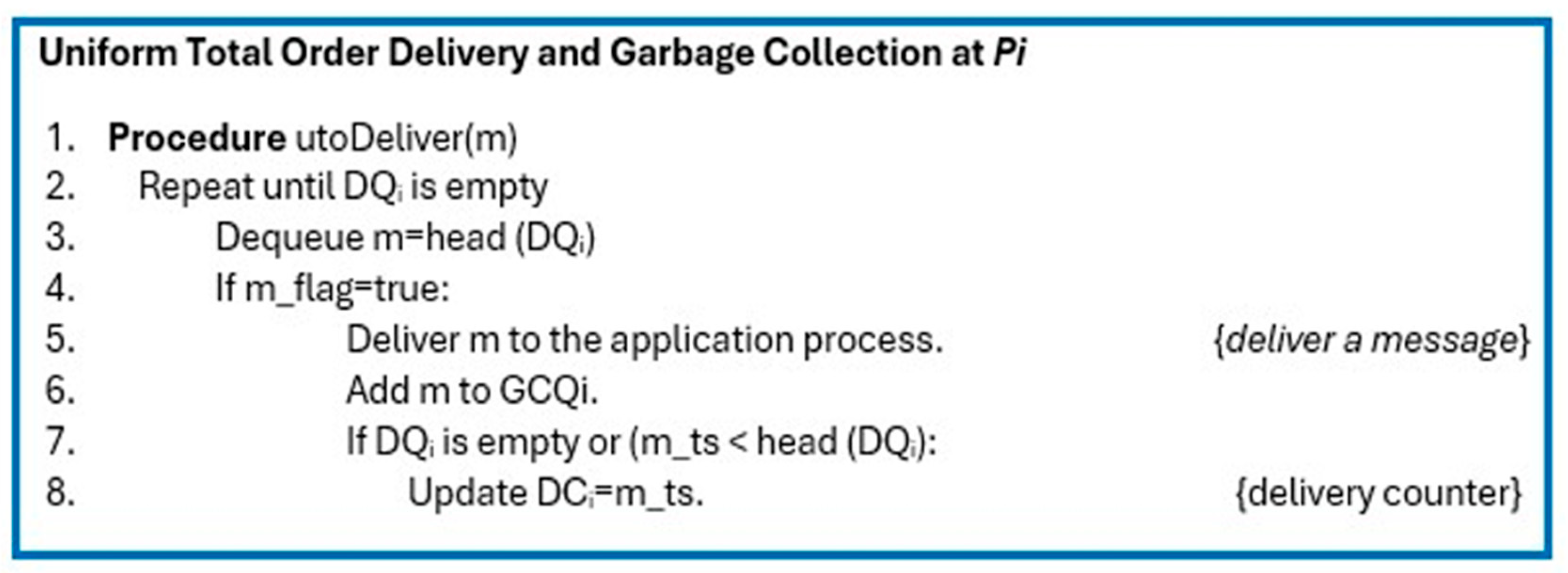 17]. As a result, at least two processes are always operational and connected. Thus, an Eventually Perfect Failure Detector (♦P) was assumed in this study’s system model, operating under the assumption that N = 2f + 1 nodes are required to tolerate up to f crash failures. This approach enables the new protocol to manage temporary inaccuracies, such as false suspicions, by waiting for a quorum of at least f + 1 nodes before making decisions. This ensures that the system does not advance based on incorrect failure detections. Secondly, the last process of each sender is designated to determine the stability of messages. It then communicates this stability by sending an acknowledgement message to other processes. When the last process of the sender receives the message, it knows that all the logical clocks within the system have exceeded the timestamp of the message (stable property). Then, all the received messages whose timestamp is less than the last process logical clock can then be totally ordered. In addition, a new concept of “deliverability requirements” was introduced to guarantee the delivery of crashproof and stable messages in total order. A message is crashproof if the number of messages
