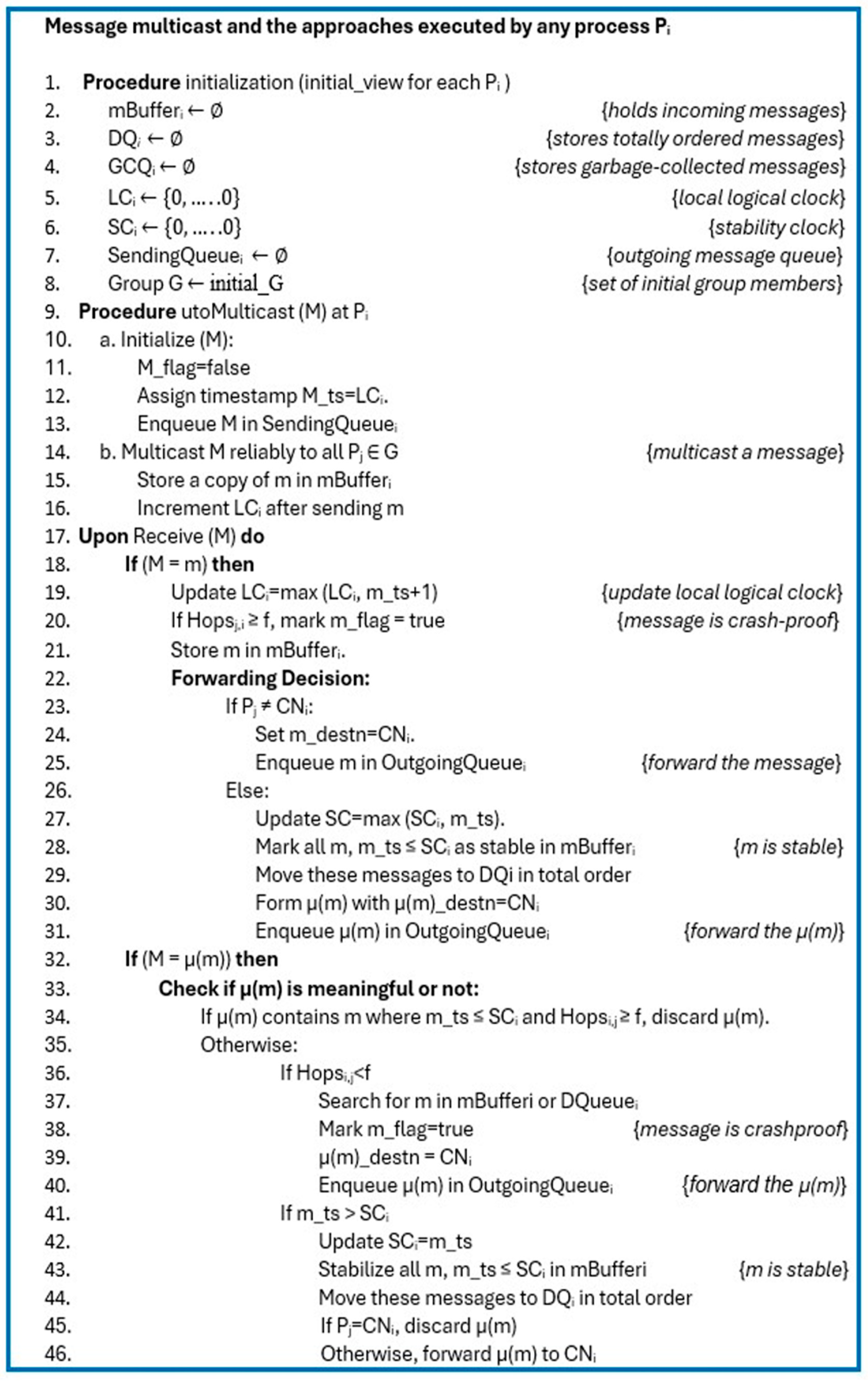 8]. A logical clock is a mechanism used in distributed systems to assign timestamps to events, enabling processes to establish a consistent order of events occurring. Thus, a total order protocol is a procedure used within distributed systems to achieve agreement on the order in which messages are delivered to all process replicas in the group. This protocol ensures that all replicas receive and process the messages in the same order, irrespective of the order in which they were initially received by individual replicas. While total order protocols play a critical role in maintaining consistency and system reliability, achieving crash tolerance requires the implementation of additional mechanisms. One such mechanism, as defined in our work, is the crashproofness policy. Specifically, this policy dictates that a message is deemed crashproof and safe for delivery once it has successfully reached at least f+1 operative processes, where f is the maximum tolerated failures in a group.