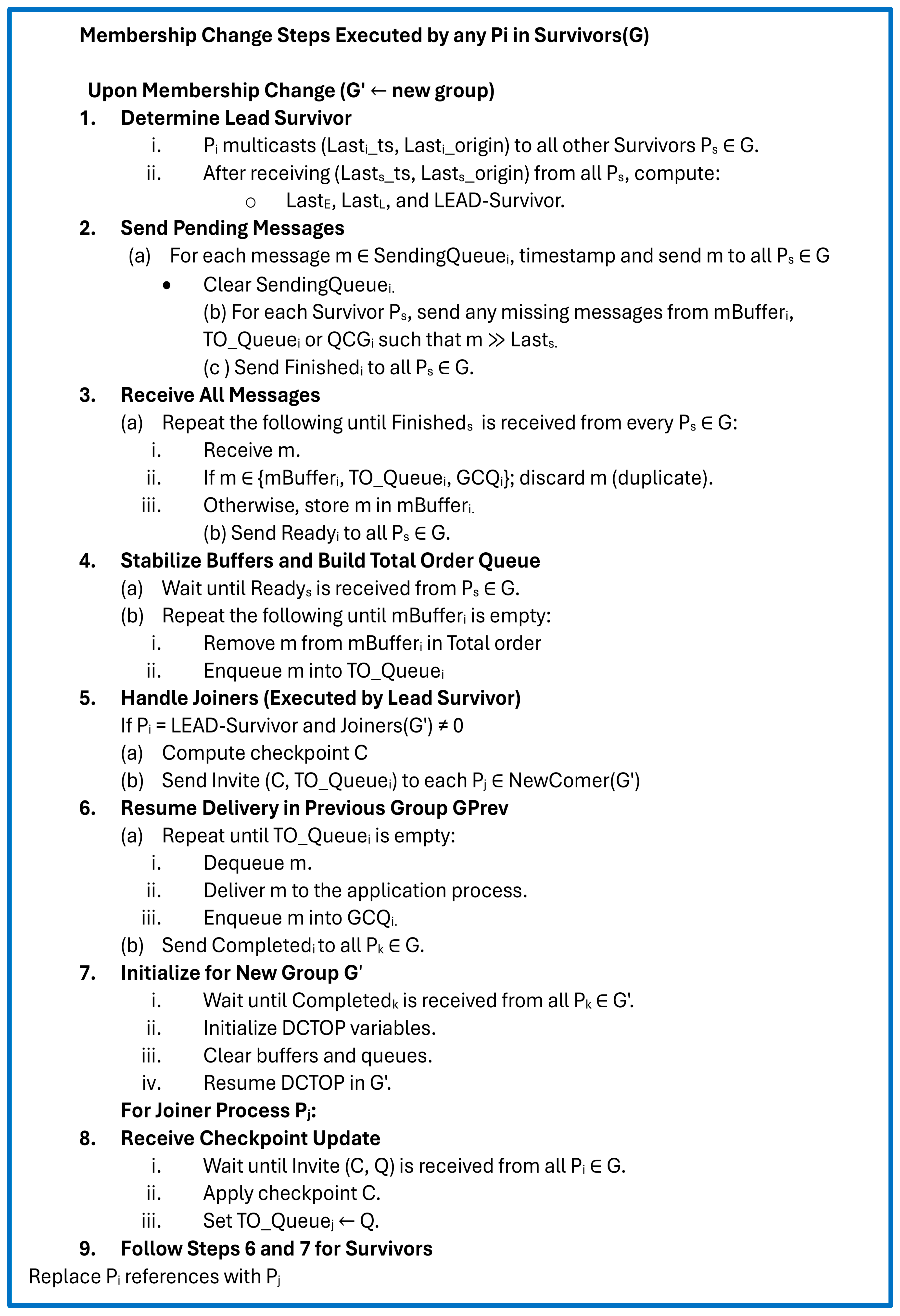 32] adopts a modular state machine replication design that scales consensus components independently to remove the leader bottleneck in traditional protocols. While this improves the throughput, it introduces a higher latency and greater implementation complexity. In contrast, the DCTOP achieves a low-latency concurrency through a simpler ring-based, leaderless structure using Lamport timestamping for efficient total order delivery. Building on the foundation established by ring-based broadcast [