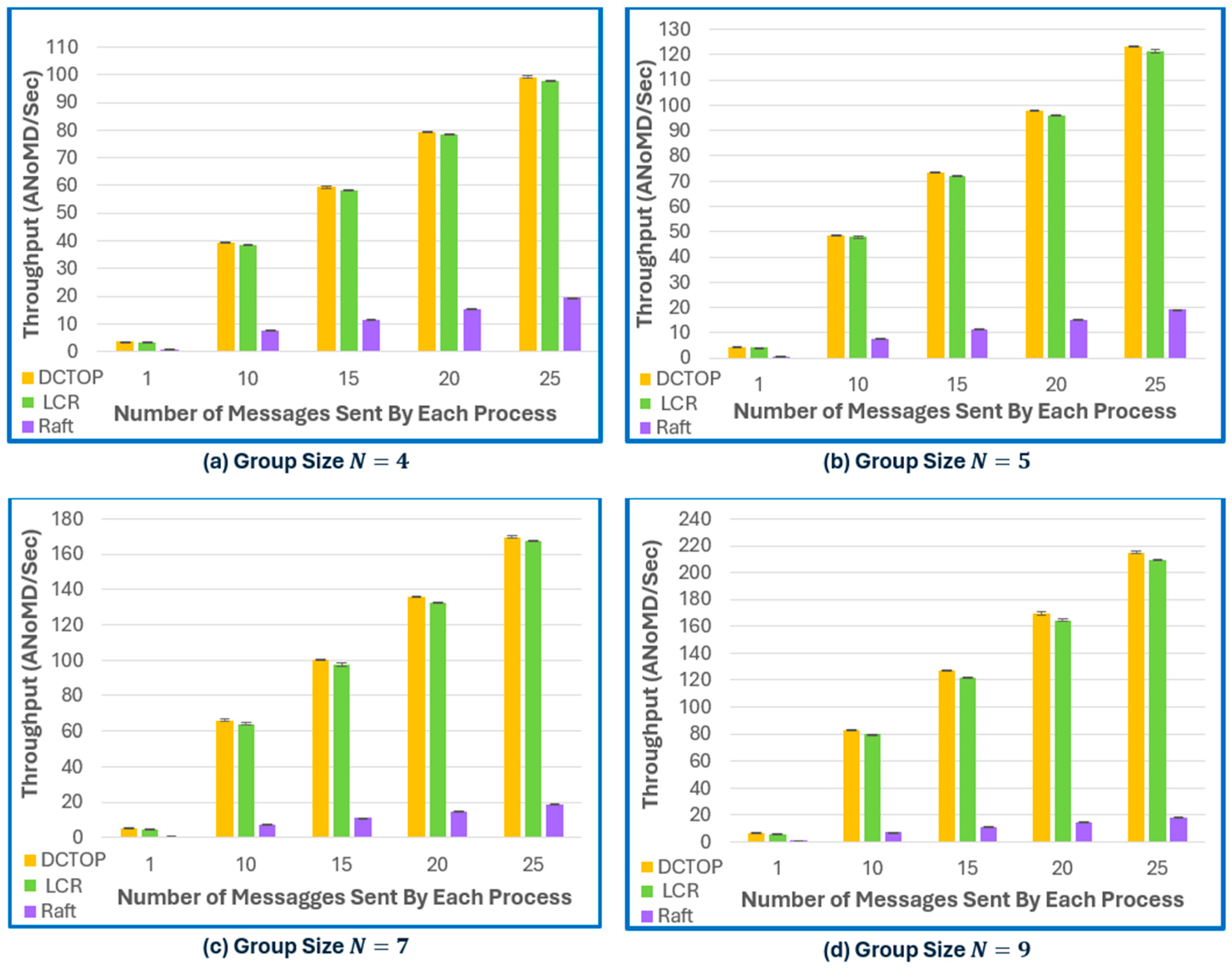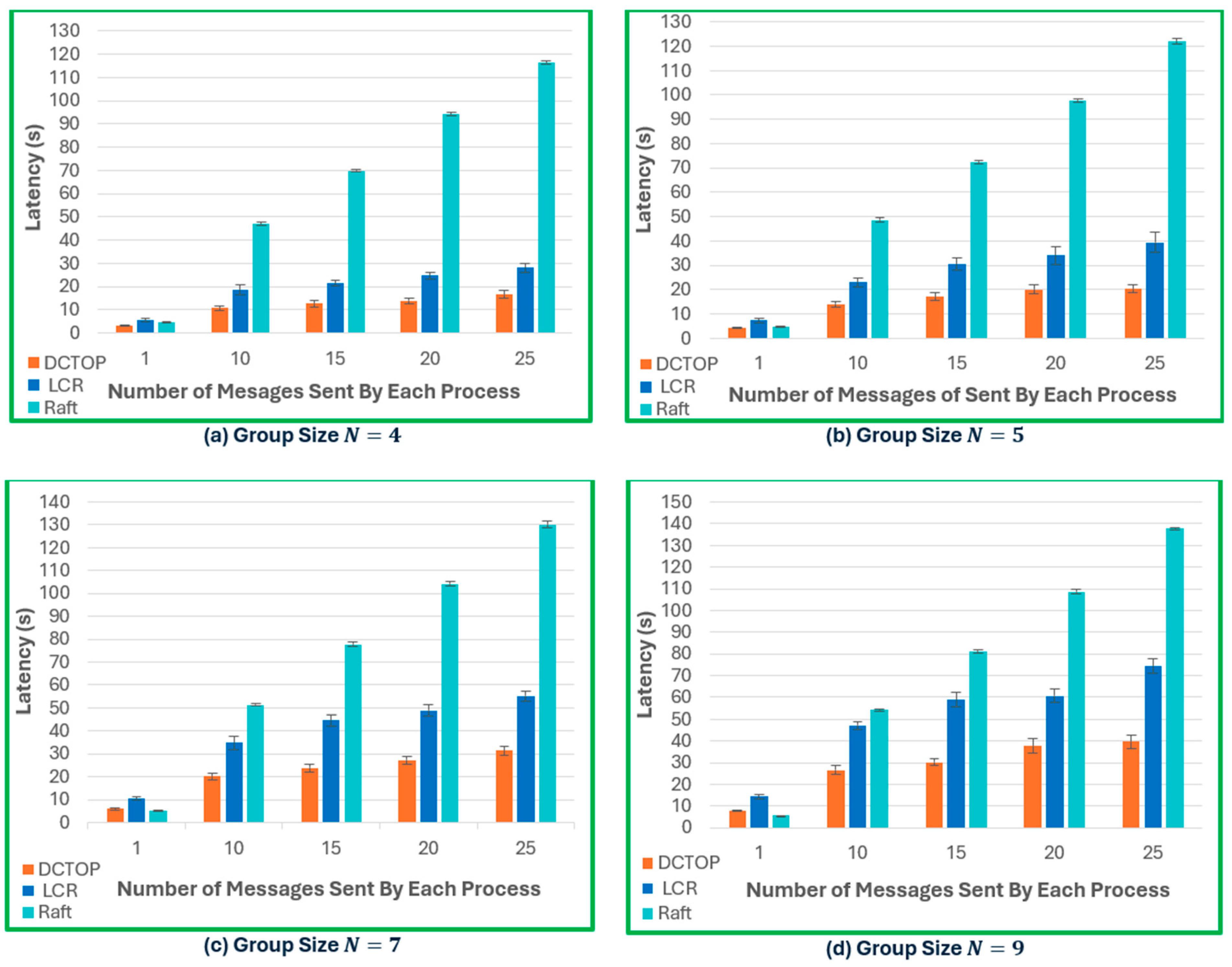 Figure 8a–d, the latency trends for the DCTOP, LCR, and Raft across increasing group sizes (N = 4, 5, 7, and 9) and message volumes reveal distinct performance characteristics. The DCTOP consistently exhibits the lowest latency across all configurations. This efficiency stems from its use of Lamport logical clocks for the lightweight sequencing of concurrent messages, the dynamic assignment of a unique last process for each message originator, and a relaxed crash-failure assumption that enables faster message stabilisation and delivery. LCR shows a moderately higher latency, which increases with both the group size and message load. This behaviour can be attributed to its reliance on the vector timestamp, whose dimensionality scales with the number of processes, and the use of a globally fixed last process for concurrent message ordering. Together, these design choices introduce larger message headers and a higher coordination overhead, particularly in larger groups. Raft, as a leader-based protocol, consistently incurs the highest latency, especially under heavier loads. The centralisation of log replication and client handling at the leader creates a sequential processing bottleneck, which limits the responsiveness as the system load grows. However, under lower traffic conditions (e.g., 1 million messages per process), Raft performs competitively and, in configurations with N = 7 (see