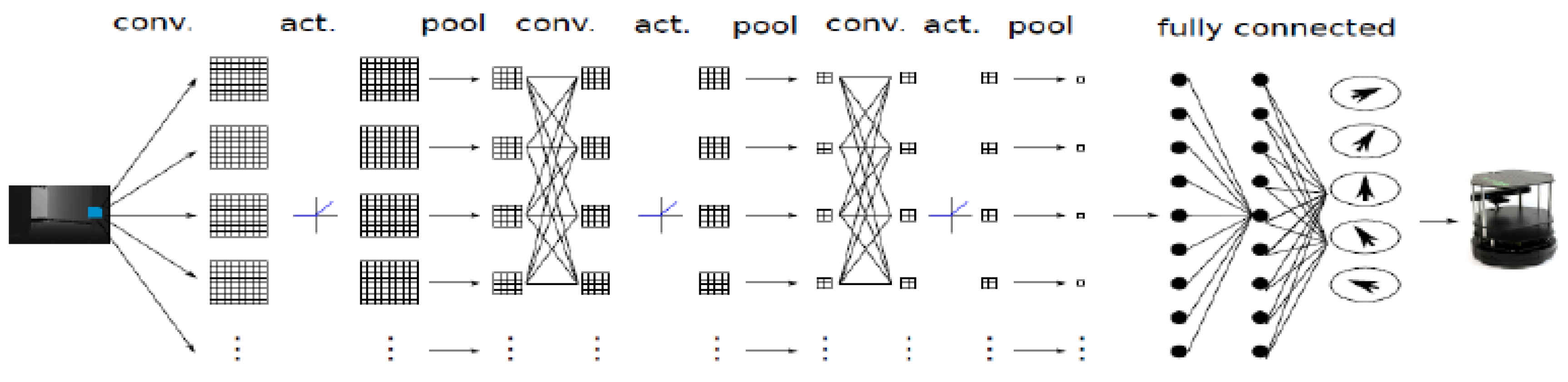 The convolutional neural network presented in this study is derived from a conventional two-dimensional CNN architecture through targeted structural modifications, rather than being proposed as an entirely new model. The original configuration follows a standard vision-based processing pipeline, where two-dimensional images are progressively transformed through convolutional and pooling stages before being mapped to navigation-related outputs via fully connected layers. This conventional setup is adopted as a reference point to allow the effects of the proposed architectural changes to be examined in an explicit and controlled manner. Within the reference model, the expressive capacity of the network is primarily expanded by increasing the number of convolution–pooling layers. Each convolutional layer operates at a fixed spatial scale and performs similar feature extraction operations. As a result, deeper configurations tend to amplify already learned visual patterns instead of introducing qualitatively different representations. For perception-driven navigation tasks, such behavior may be insufficient, as mobile robots must simultaneously reason about local obstacle details and the global structure of the surrounding environment. The proposed architecture departs from this depth-centric design philosophy by redefining the role of individual convolutional layers. Rather than increasing network depth, each layer is engineered to capture visual information at multiple spatial resolutions within a single processing step. This is realized through parallel convolutional operations employing kernels of varying sizes. Smaller receptive fields emphasize fine-grained visual cues such as object boundaries, while larger receptive fields encode coarse spatial information related to traversable regions and scene layout. The parallel responses are subsequently combined, enabling the network to integrate localized and contextual information at an early stage of processing. Through this reformulation, network depth is no longer interpreted as a mere count of sequential layers. Instead, depth is associated with the diversity and richness of representations formed within each layer. This interpretation is particularly suitable for vision-based mobile robot navigation, where reliable decision-making depends on the joint availability of precise local perception and broader environmental awareness. By embedding multi-scale reasoning directly into each convolutional layer, the architecture achieves richer representations without relying on excessive layer stacking.