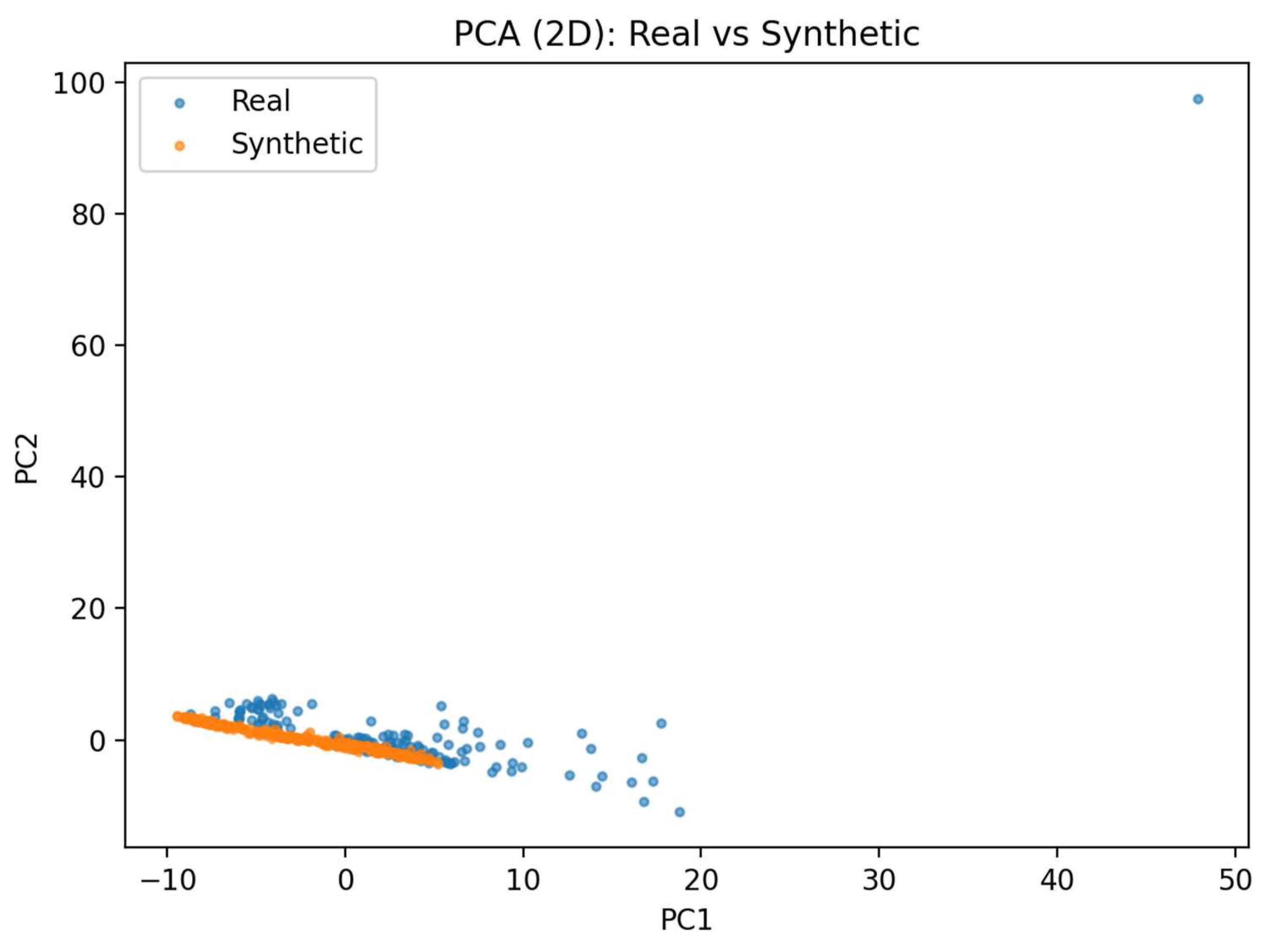 Figure 6 below, plotting real and synthetic samples together to provide an interpretable overview of their overlap in feature space. This pipeline produces the metrics and figures automatically, ensuring that the fidelity assessment is objective, repeatable, and suitable for deployment under real operating conditions. Prompts explicitly instructed uniqueness, labeling, and absence of nulls, but adherence varied, underscoring LLM limitations for tabular synthesis.
