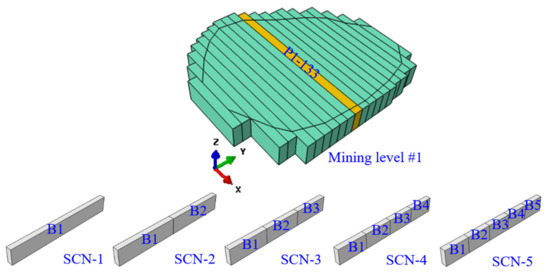 As shown in Table 2, for backfilling scenario SCN-1, after the completion of the excavation of the stope, the stope will be backfilled in one time to backfill the whole void of the stope. Backfilling scenario SCN-2 takes two steps to finish the backfilling, the first step is B-1, and the second step is B-2. For backfilling scenario SCN-3, once the stope is mined out, it takes three steps to backfill the stope void with three equal backfilling parts, B-1, B-2, and B-3. Backfilling scenario SCN-4 and SCN-5 will take four and five steps to complete the backfilling, from B-1 to B-4 and B-5, respectively. In this paper, an assumption is made that once the CRF is backfilled, it takes into effect immediately, and the curing time is ignored.