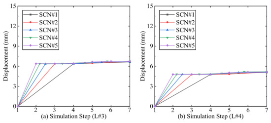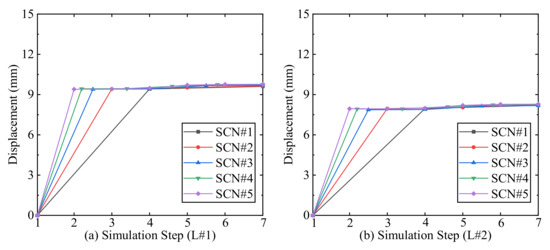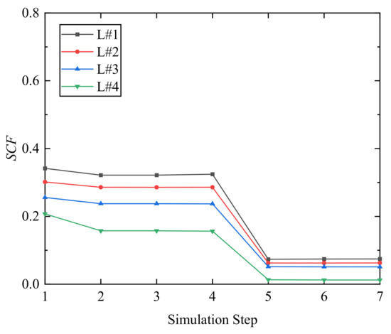 At the starting geostatic Step1, the sidewall stress concentration factor has the maximum value in level #1 and level #2, as shown in Figure 7. After the excavation Step2, the stress concentration presents a stable status without noticeable changes among SCN-3, SCN-4, and SCN-5, while for the scenarios of SCN-1 and SCN-2, the changes are more extensive. After the backfilling body takes effect, the stress concentration factor witnesses a sharp decrease and achieves a stable value of about 0.05 in level #1 and level #2 among the five different backfilling scenarios. The sidewall stress concentration factor (SCF) sees a 76% decrease in level #1, and level #2 sees a 77% decrease.
