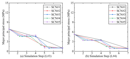 With the mining levels close to the top surface of the mining pipe, the starting principal stress level at Step1 decreases, and the final principal stress at the last Step7 sees a slight difference among the four mining levels. When the backfilling starts to affect all four mining levels, the backfilling body will share the mining-induced redistributed stress. SCN-5 gives an evident change trend to this. When the backfilling body takes into effect, the principal stress sees a plunge from Step4 to Step5, and after that, the principal stress achieves a stable status. The decreasing percentages of the major principal stress from before-excavation to after-backfilling of these four mining levels are very close to each other, with a value over 80%.