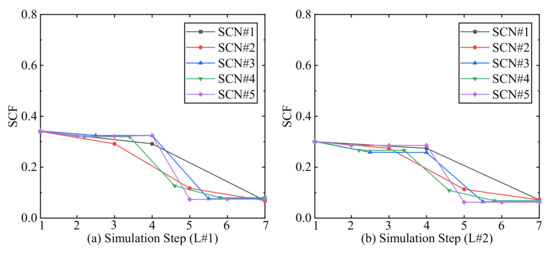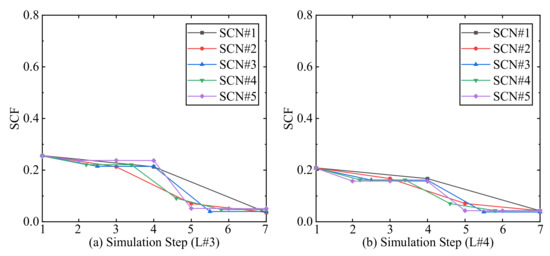 Similar to the major principal stress trend, the initial stress concentration factors of the sidewalls in level #3 and level #4 are smaller than those of the two deeper mining levels, as shown in Figure 8. For the scenarios SCN-1 and SCN-2 at both levels, the sidewall stress concentration factor witnesses a constant decrease, and the decreasing amplitude is larger when the backfilled CRF takes into effect. Before the backfilled CRF takes effect, the sidewall stress concentration factor keeps almost constant in SCN-3, SCN-4, SCN-5 at both level #3 and level #4. After the backfilling body takes effect, the sidewall stress concentration factor sees a dramatic decrease and keeps constant. Level # 3 has a 78% decrease from Step1 to Step7, and level #4 achieves a 79% decrease.
