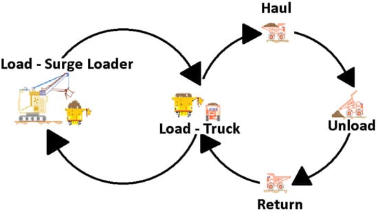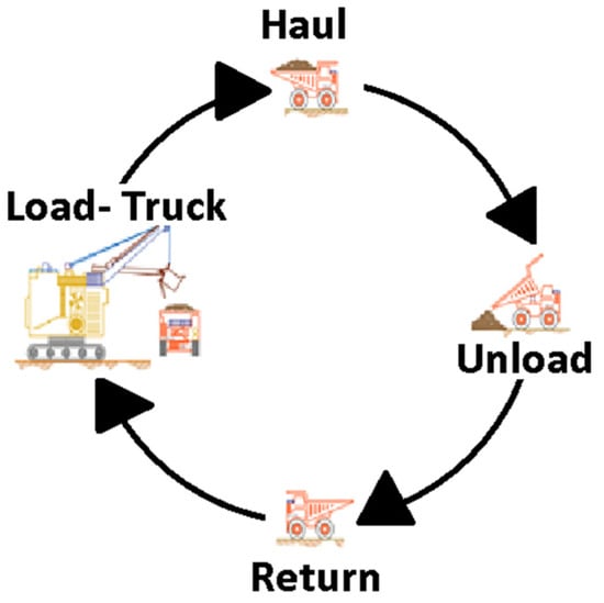 The Shovel-Truck system has undergone multiple improvements over time. One of these improvements involves optimization of the travel route, whereby the most efficient route for the system is selected through production and topographic analysis. This reduces cycle time, transport cost, and increases the productivity of the system [,]. All these changes have improved the productivity of the system as a whole, however, they have not altered the cycle itself (Figure 1) and thus only generate incremental improvements.