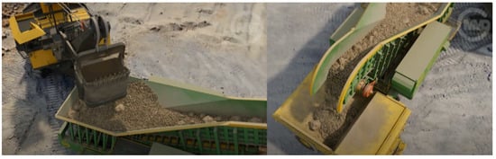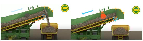 The transfer of material between the surge loader and the truck is carried out through a conveyor belt that carries the material previously deposited into the hopper by the shovel to the truck as shown in Figure 7. The belt, through strategically placed sensors, is capable of measuring the volume and weight of the material that is being delivered, managing to accurately control the fill factor of the truck [,]. Through these sensors, the surge loader is capable of detecting the presence of large rocks which can affect how this material is transported [,,]. Together with the information of the material already loaded into the truck, this allows the monitoring system to decide if the truck is capable of transporting this larger rock without exceeding safety limitations []. In this case, if the result is negative, the surge loader stops loading and gives the signal for the truck to continue its cycle with the material that was already loaded. In addition to this, the system leaves enough material between the large rock and the material discharge point to serve as a cushion for the impact of the large rock discharging (Figure 8) into the truck tray. The on-board sensor system gives the surge loader a great advantage over the conventional material transfer system (Shovel-Truck system), by accurately controlling the fill factor of the truck and significantly narrowing the fill factor variance []. Controlling the fill factor in the classic system (Shovel-Truck system) is carried out by appropriately matching the capacities of the shovel and the truck. Fill factors in the classic system are also influenced by manoeuvrability, the distribution of the material in the shovel bucket, material fragmentation, and operator competence []. The effects of many of these items are diminished with the incorporation of a surge loader.