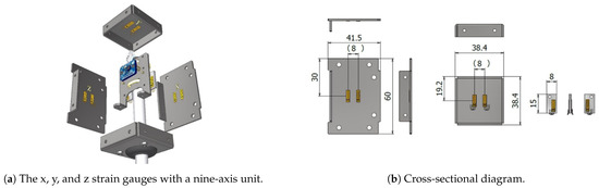 The sensor unit, developed by [37] can be installed by drilling a hole into the support system of an underground mine with a 60 drill-bit. The computer-aided diagram of the sensor unit is shown in Figure 2. In Figure 2a,b the blue-coloured unit, installed close to the centre of the device, is the sensing unit. In addition to a pair of strain gauges attached on the X, Y and Z surface, a nine-axis sensor (LSM9DS1) is installed to detect the orientation of the sensor unit during installation.