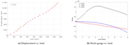 A load response test was conducted, using Marui’s manual uniaxial compression testing machine (the rated capacity of the load cell is 20 tf) to apply a load to the sensor unit. The load was varied in increments of 50 kgf, and the load-displacement curve (between elastic deformation), the strain, acceleration, angular velocity, and geomagnetism of the sensor unit were collected as the measurement data. The displacements from different load values and strain in the experiments are shown in Figure 3.