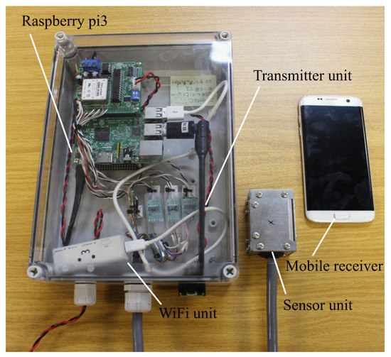 The sampling frequency was set to 1 Hz, and the data were transmitted to the receiver via ad hoc communication (WiFi Direct). In the material test, the load was applied up to 5 MPa in terms of stress. By following the steps above, the possibility of the in situ stress measurement in underground mine via WSN is shown. In situ stress and displacement in the underground mine requires attitude and stress detection of the sensor unit. This enables us to identify the direction and the degree of stress in the underground mine. In Figure 4, a complete system with integrated the wireless transmitter with the data logger is shown.