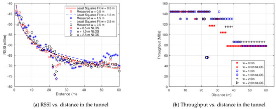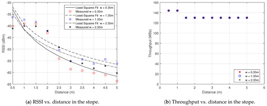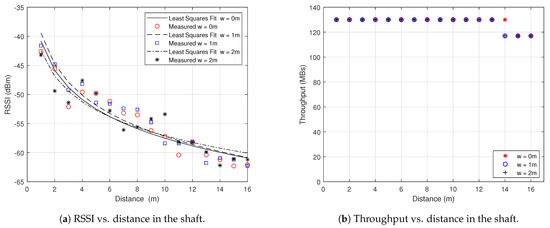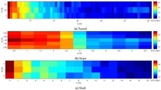 The heat maps in Figure 9a–c show more detailed RSSI distributions across the width of the measurement areas. The transmitter was placed in the centre of the width w of the measurement area, and the RSSI values are obtained along the w axis every 0.5 m in the tunnel, 1 m in the shaft and 0.35 m in the stope. The throughput was measured in terms of bits transmitted per second or bits per second (bps).