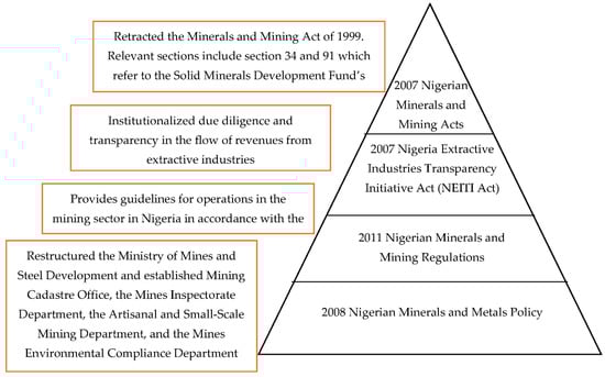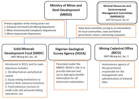 There are legal and regulatory documents and institutions that govern the activities of artisanal and small-scale miners in Nigeria. Figure 1 and Figure 2 show the existing legal, regulatory, and institutional frameworks for Nigeria’s mining sector. Aside from the frameworks, policy objectives guide the everyday activities within the mineral value-chain. These objectives include but are not limited to comprehensive actions on the acquisition of rights, mine ownership requirement and restrictions, minerals processing and export, transfer mineral rights, land use, environmental, mineral titles, health and safety, and constitutional law. Despite these frameworks, Nigeria’s mining sector is yet to reach its full potential [40,41,42].